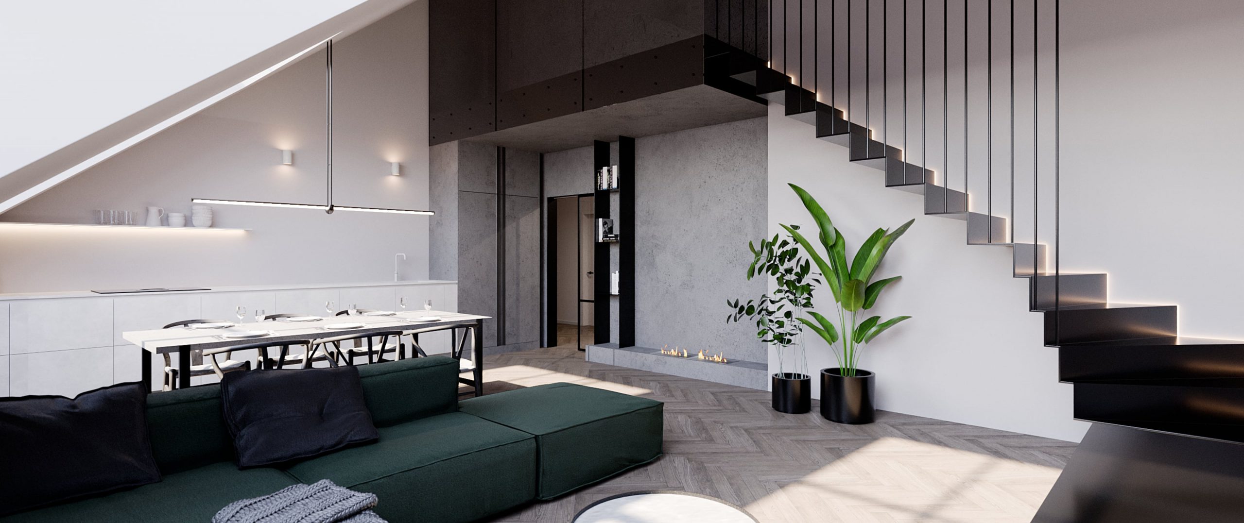 Zhruba uprostřed levé části chodby se vchází do obývacího pokoje s kuchyňským koutem, který je díky dvěma velkým střešním oknům, jednomu kulatému oknu u podlahy a designovému schodišti s galerií ústředním bodem bytu, který propojuje obě patra v jeden harmonický celek.