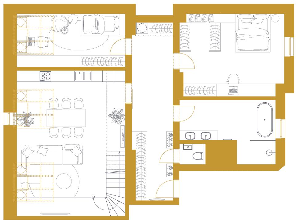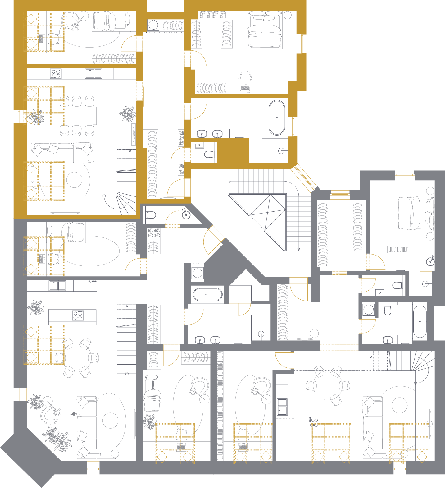 Mezonetový byt 4+kk o rozloze 183,3 ㎡ s terasou 8,2 ㎡, se saunou a dvěma koupelnami.