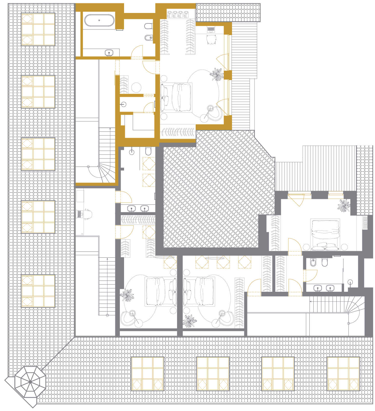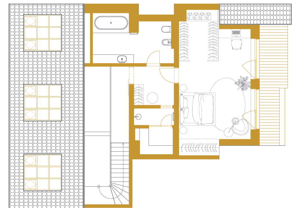 Z galerie v 6. NP se dostanete do chodby, ze které se vstupuje do tří místností: do koupelny s vanou, do sprchového koutu se saunou a do prosvětlené rozlehlé ložnice se šatnou a pracovním koutem, ze které můžete dvěma francouzskými okny vstoupit na terasu orientovanou do vnitrobloku, která skýtá báječný prostor k relaxaci a lenošení.